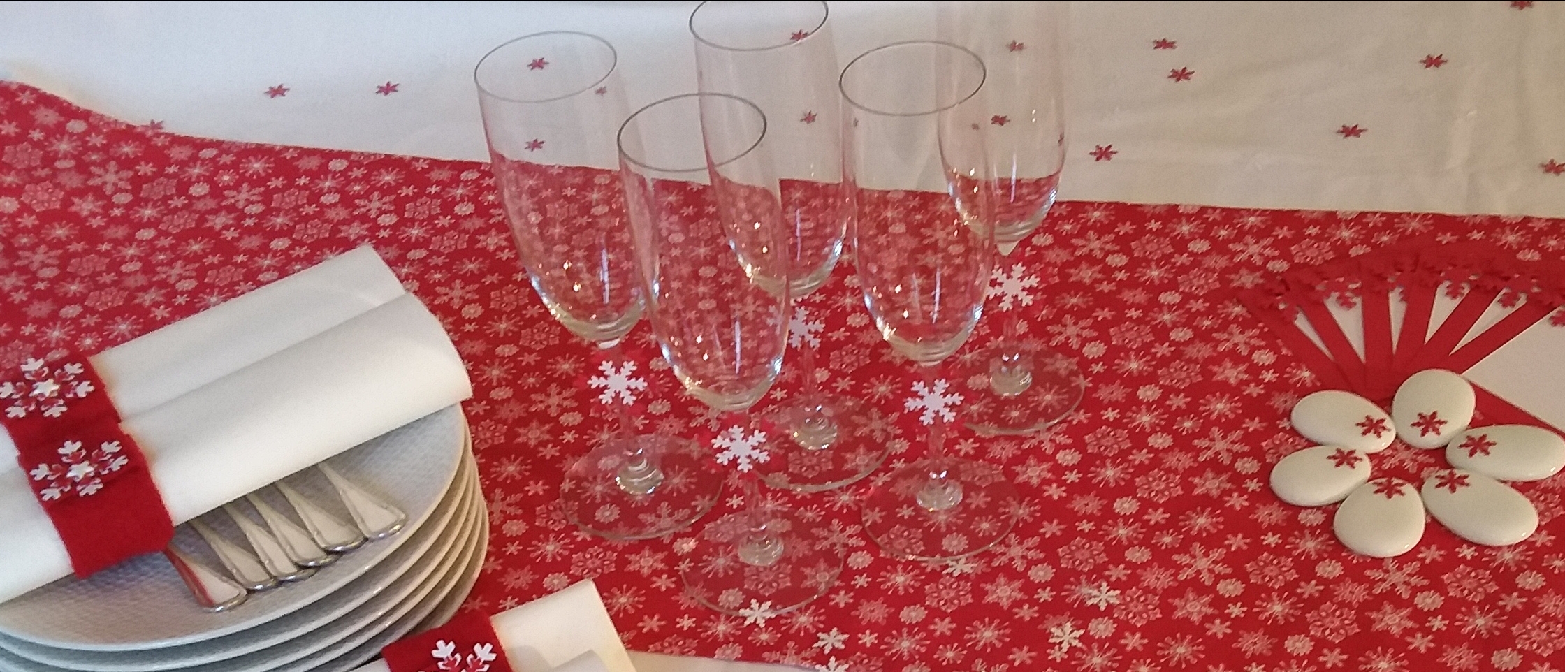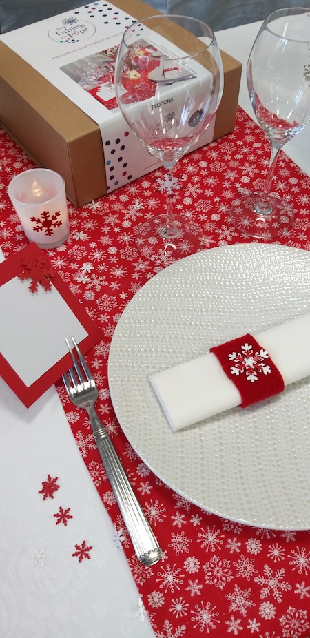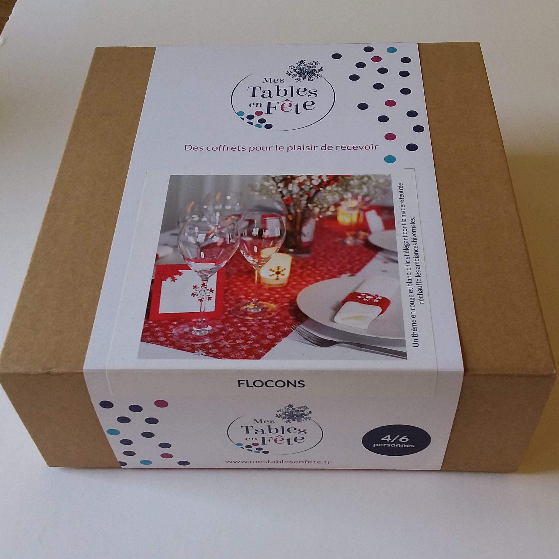 Les coffrets Flocons sont composés de différents éléments pour la décoration du centre de table et autour de l’assiette de chaque invité (attention ! La vaisselle, les verres et couverts n’en font pas partie) .