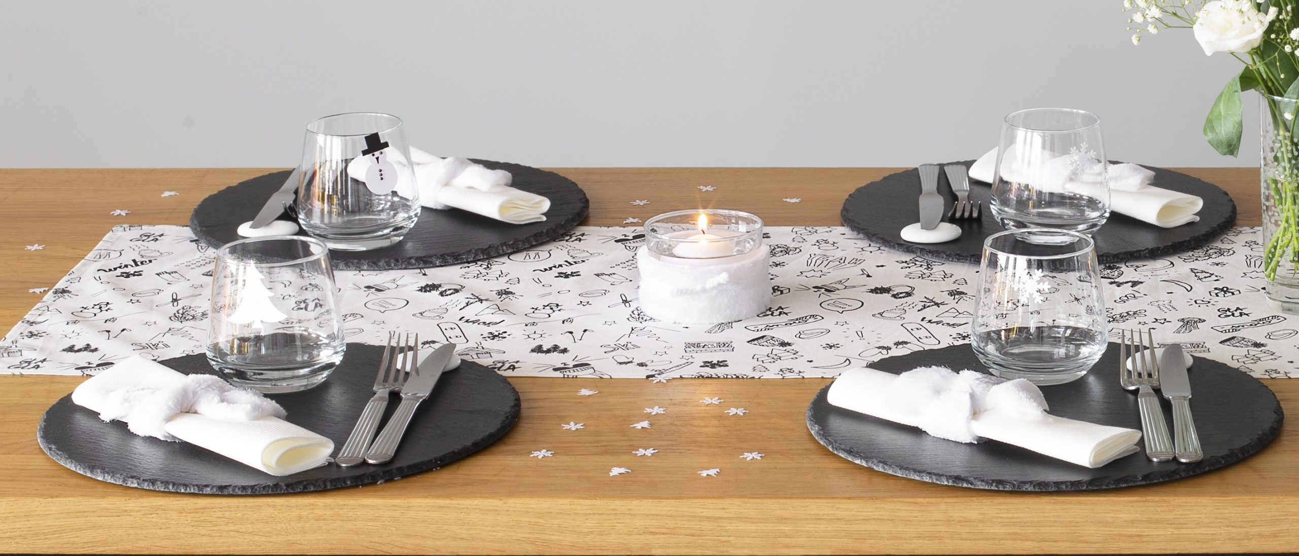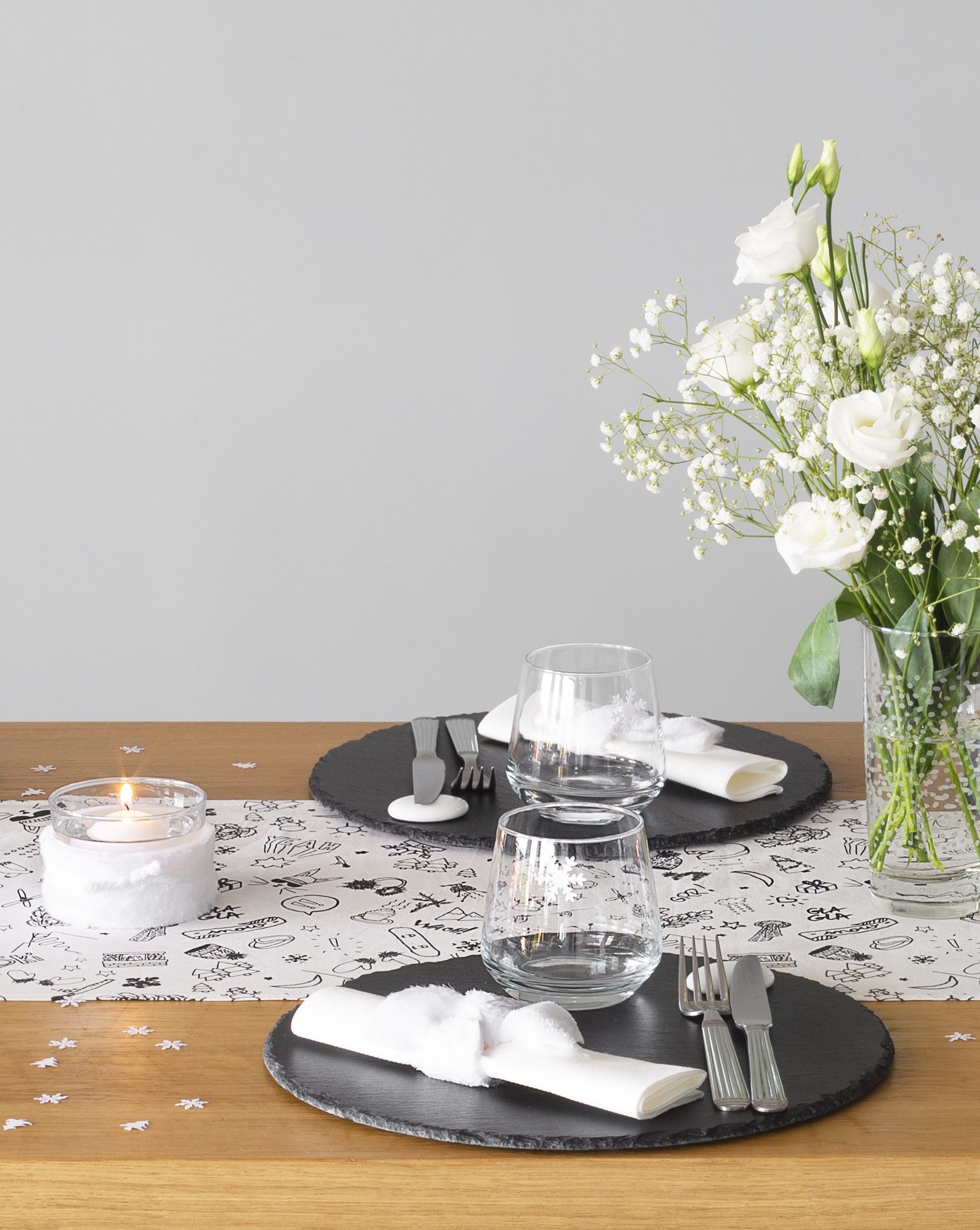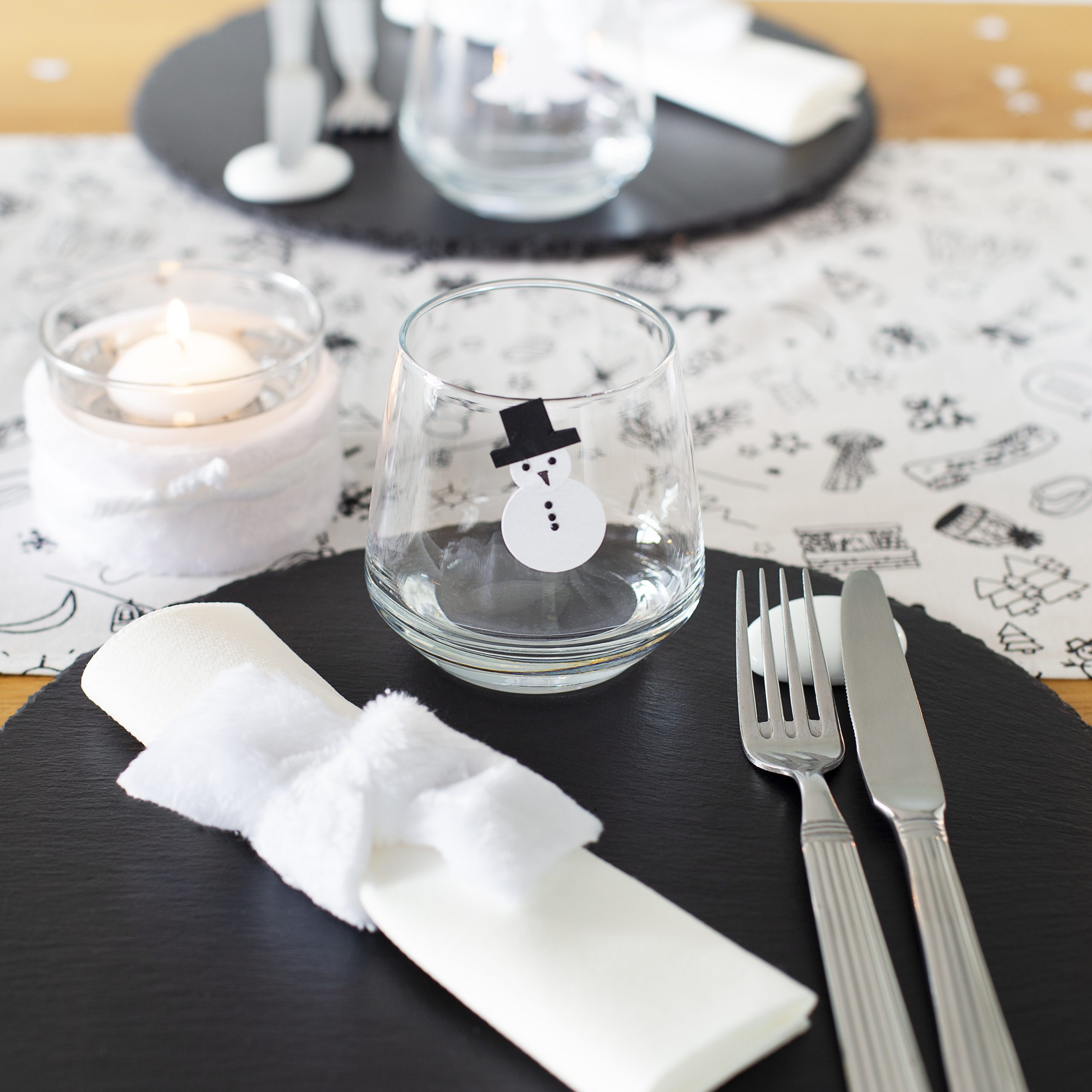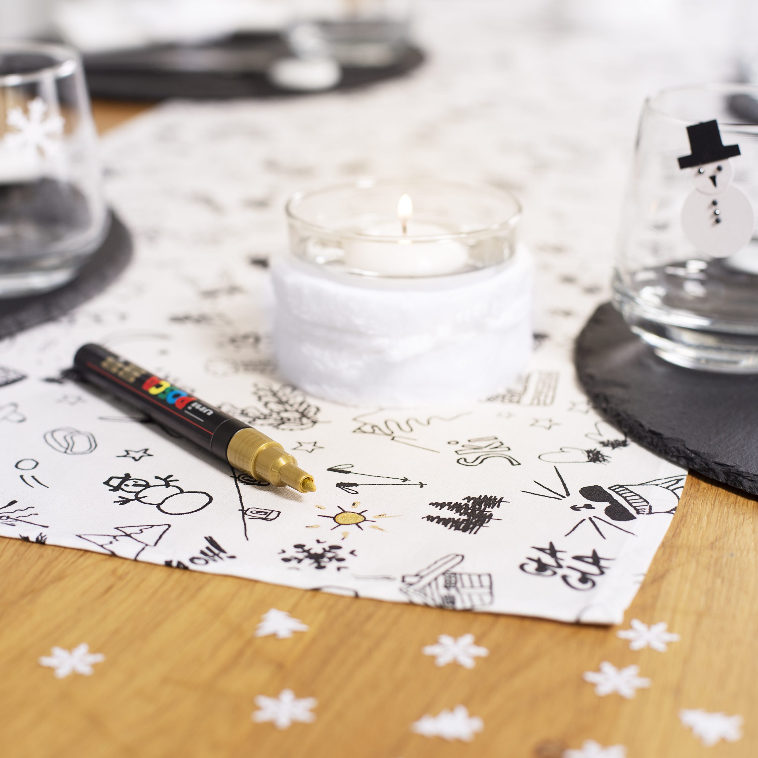 Pour rendre chaleureuse cette création, nous avons travaillé différentes matières premières de qualité comme le tissu « Doudou » tout doux qui imite la fourrure mais aussi le coton, le verre et du beau papier pour les décorations des verres. Les serviettes ont un touché doux et épais comme celui du tissu. Voici une idée pour animer votre repas : avec le stylo or spécial tissu, faites personnaliser le chemin de table par les invités et rendez-le unique. Idéal aussi pour un goûter d’enfants ou faites entrer la couleur avec différents feutres pour tissus et un chemin de boules de noël de différentes couleurs (non fournis).
